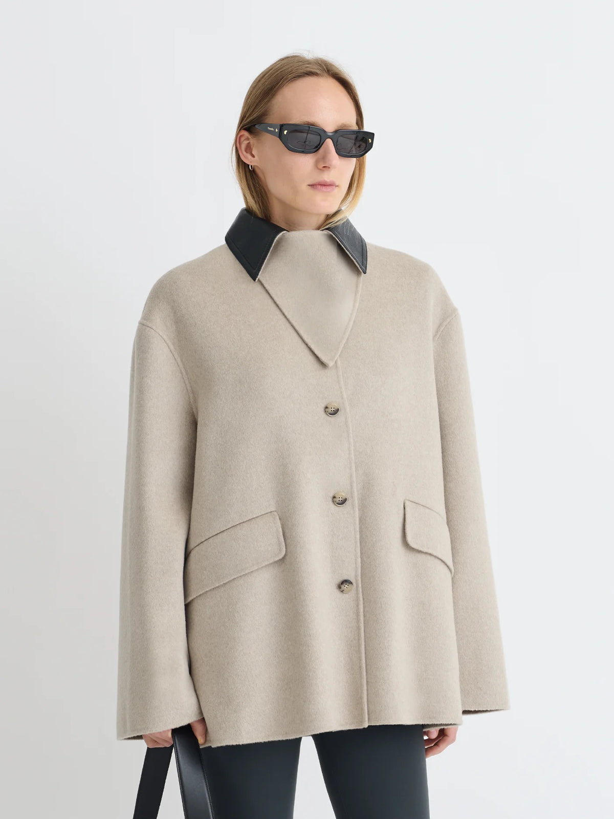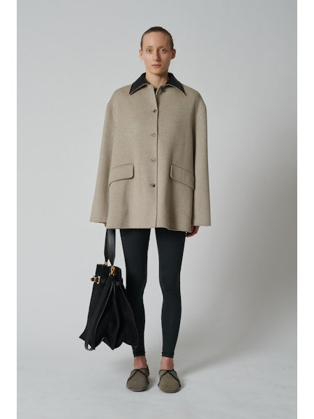 Dettagli e Vestibilità: • La modella indossa una taglia S INT • Composizione: 90% Lana , 10% Seta • Colore: Stone / Black • SKU: NW25FWJK28092SB • Made in HU